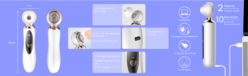 - Aspiration Puissante : Élimine les impuretés en profondeur sans endommager la peau.